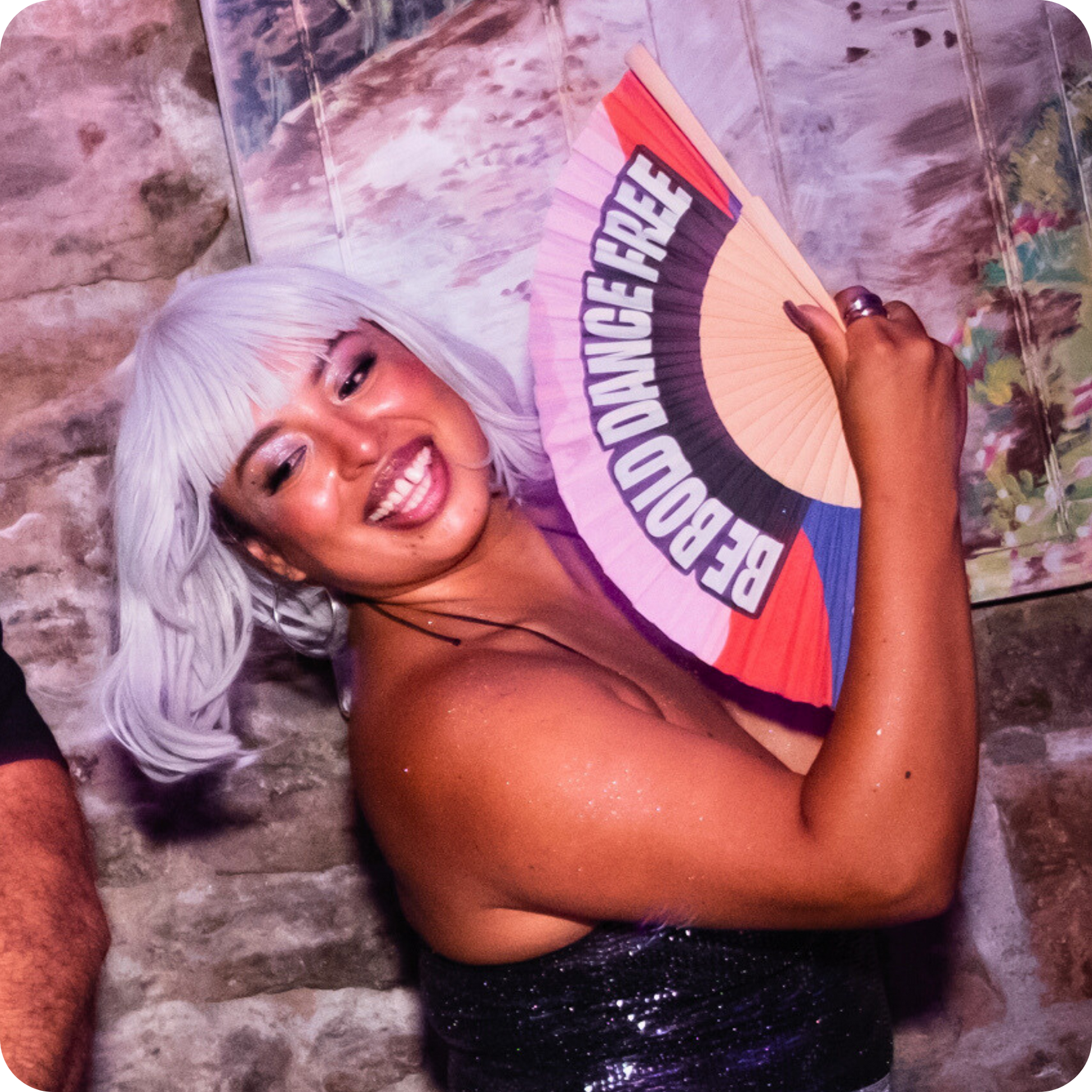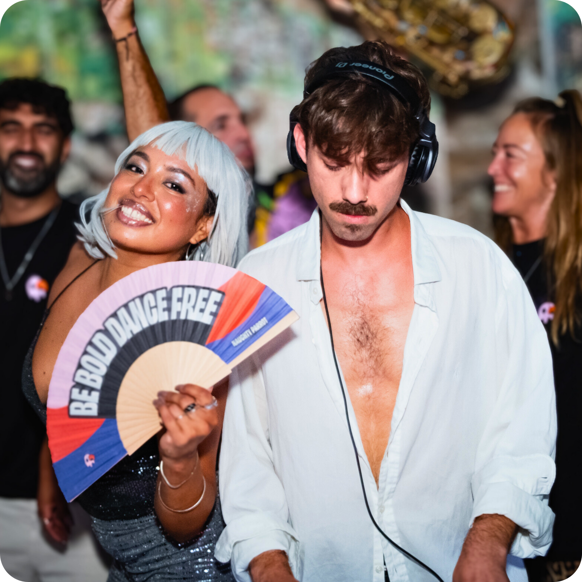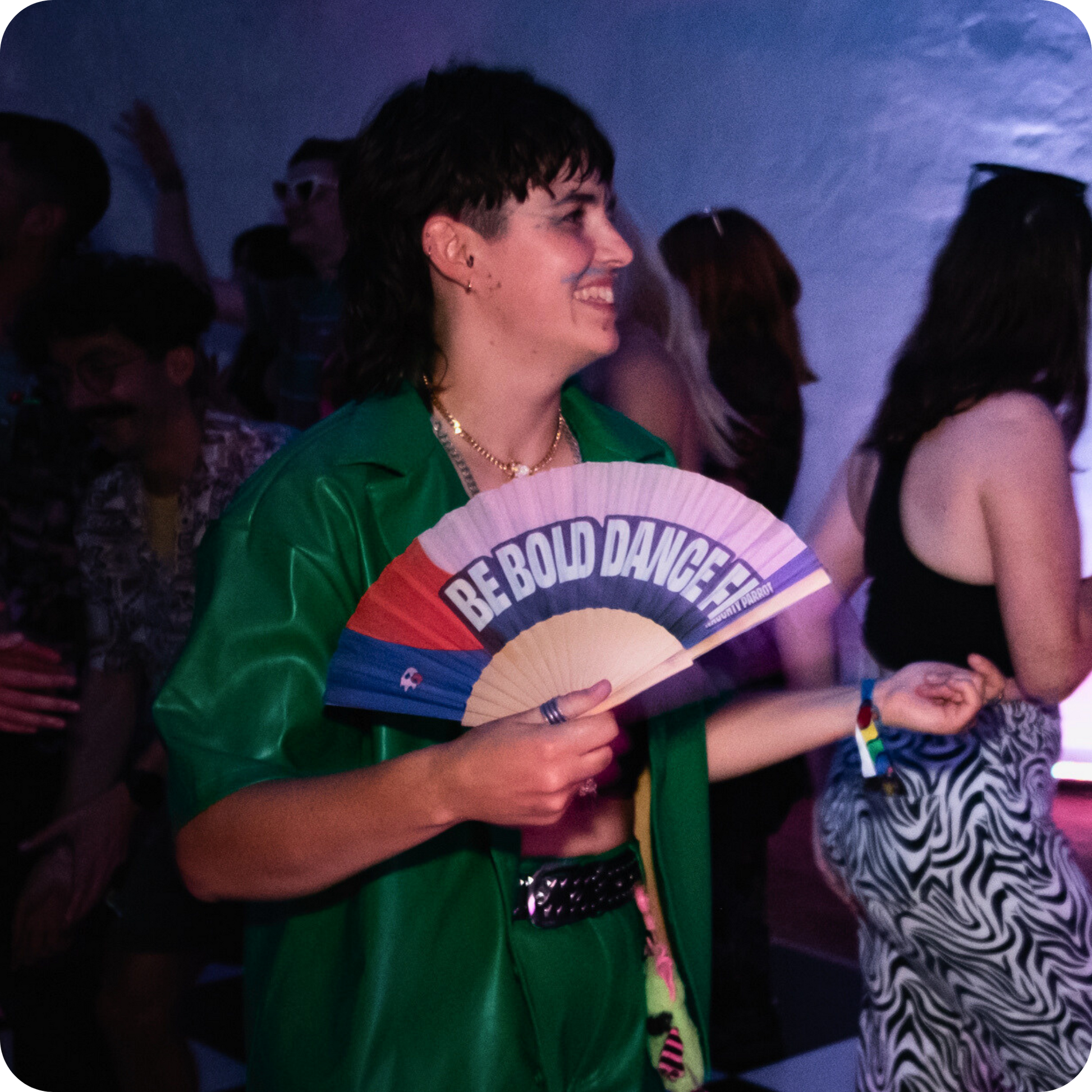 Made from smooth natural wood with bold branded fabric, this fan is your essential sidekick for raves, festivals, and sweaty sun-soaked days.